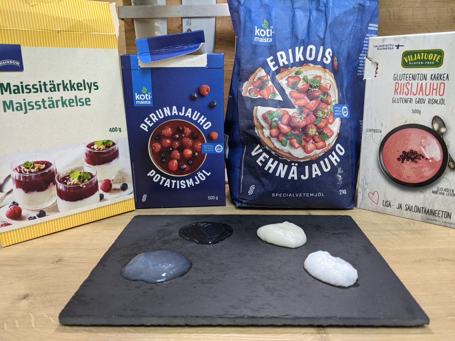 Testissä käytin seuraavia määriä tärkkelystä. Lopputuloksen koostumus erosi hieman, mutta kaikki olisivat toimineet hyvänä kastikkeena. Vettä oli 100 ml jokaisen tärkkelyksen kanssa.
