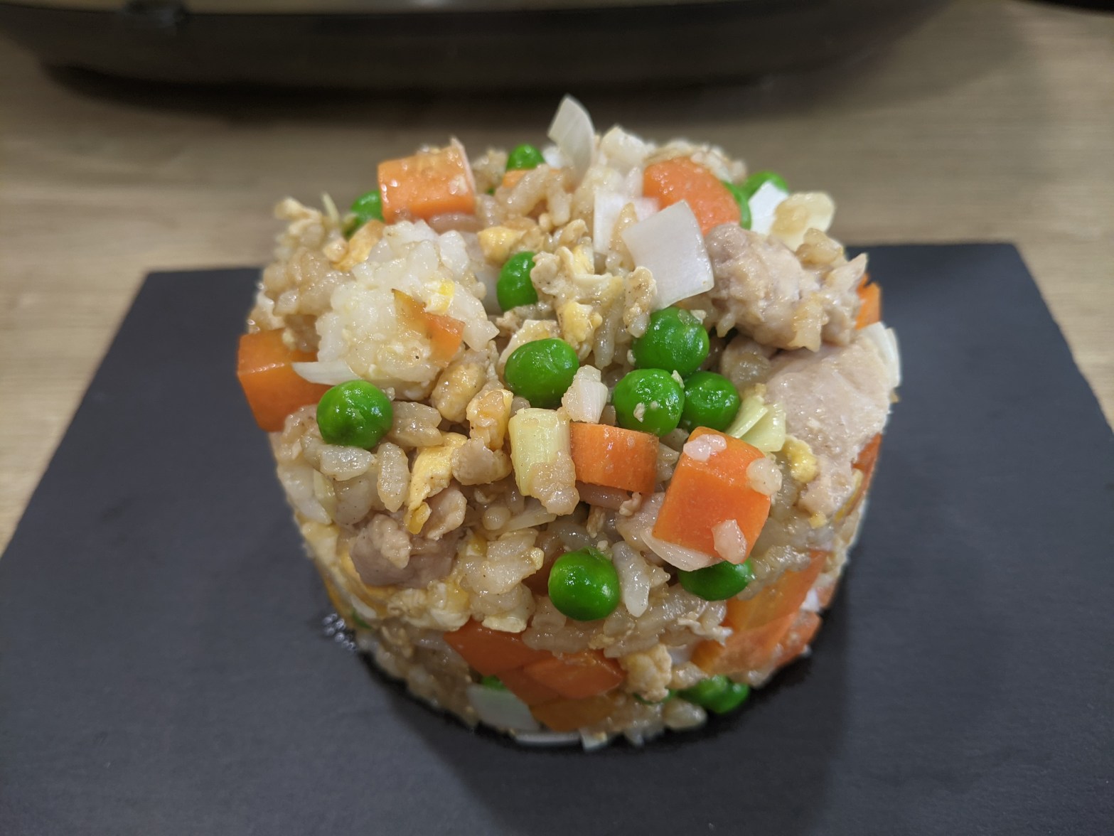 Ruskista kana, siirrä pois pannulta. Paista A yhtä aikaa, kunnes riisi on rapeaa. Siirrä A pannun sivuille, paista kananmuna pannun keskellä. Mausta B:llä. Lisää C ja lämmitä kunnes herneet ovat syöntilämpimiä.