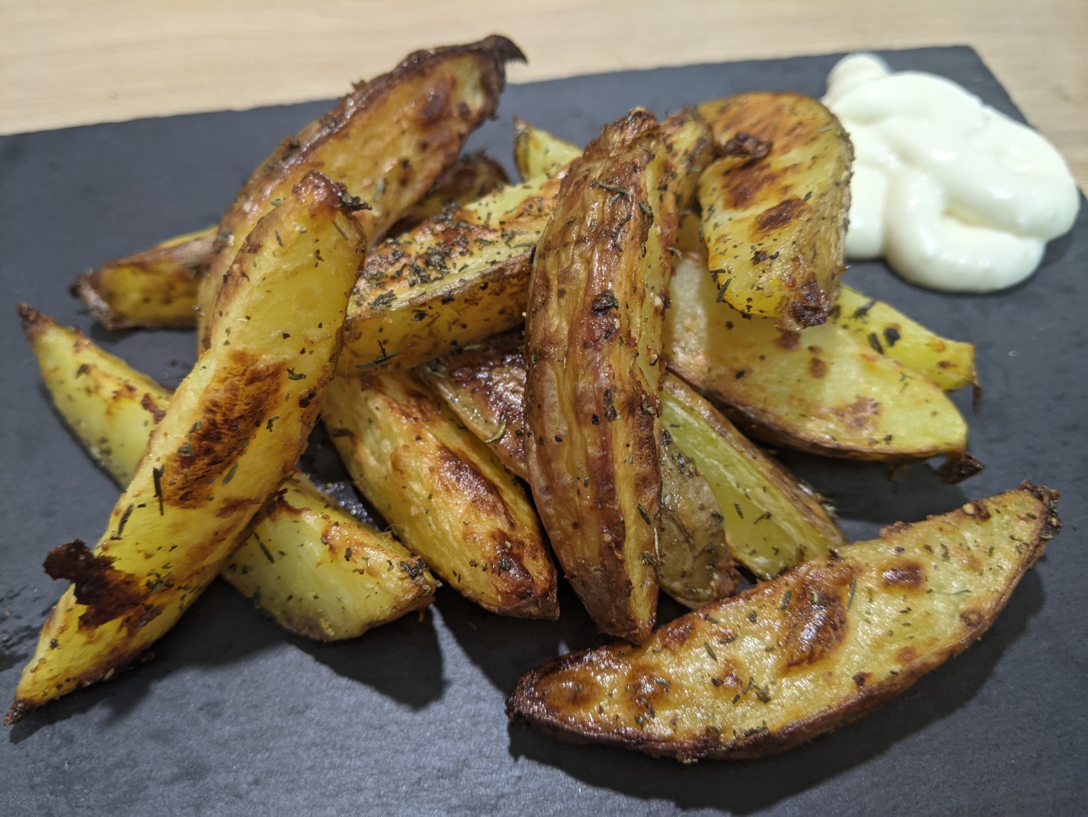 Laita uuni lämpenemään 250 °C. Leikkaa peruna lohkoiksi, esim. kahdeksasosiin, ei tarvitse kuoria. Keitä ruokasoodallisessa vedessä n. 5 min ***. Lisää A. Sekoita siten, että perunoiden pinnasta tulee epätasainen (ts. vaurioituu kevyesti). Paista uunissa 15-20 min. Tarjoile dipin kanssa.