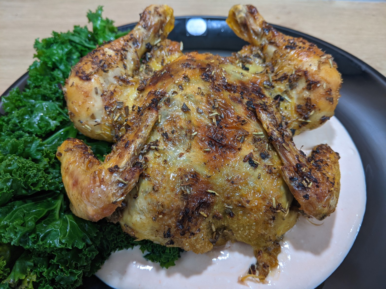 * ”To butterfly a chicken” eli kanan perhostaminen tarkoittaa, että leikataan kanan selkäranka pois ja painetaan rintalasta pöytään. Tällöin kanasta tulee tasainen ja rinta, koivet sekä siivet paistuvat suunnilleen samaan aikaan.