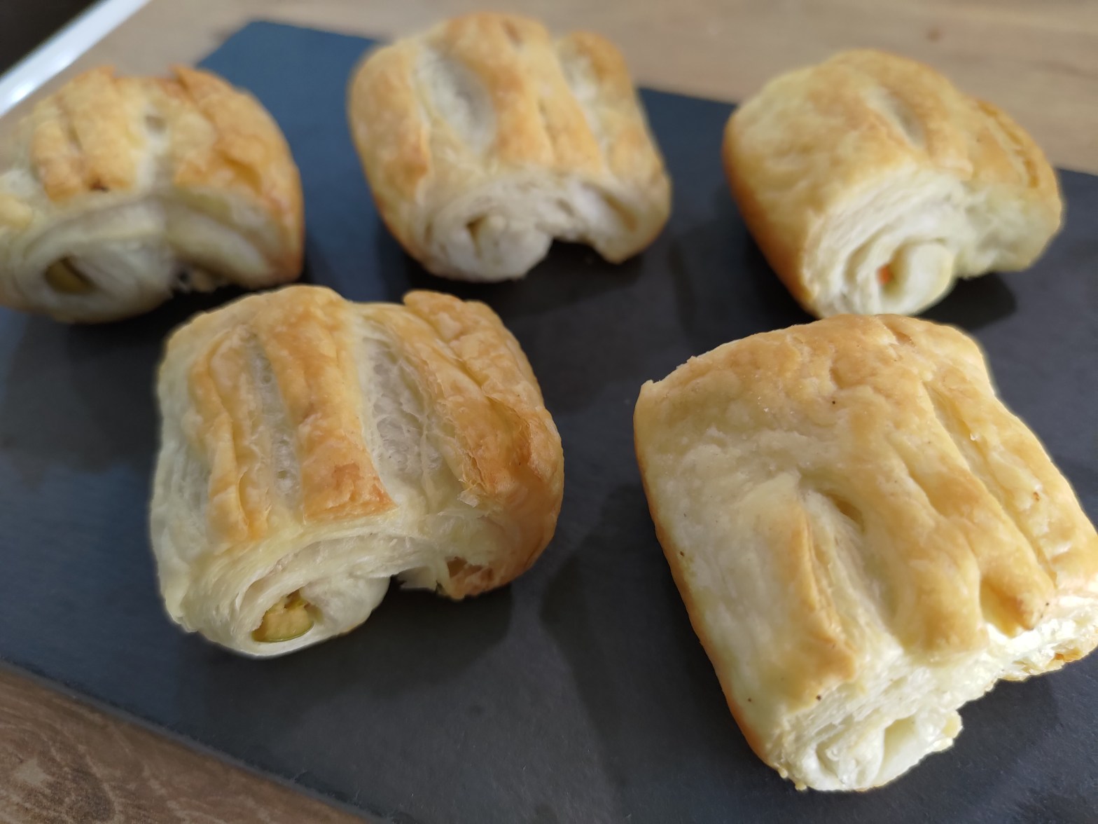 Leikkaa koko pellin kokoinen lehtitaikina yhdeltä akselilta neljään osaan, toiselta kahdeksaan. Ts. pieniksi, mutta helposti rullattaviksi suupaloiksi. ***